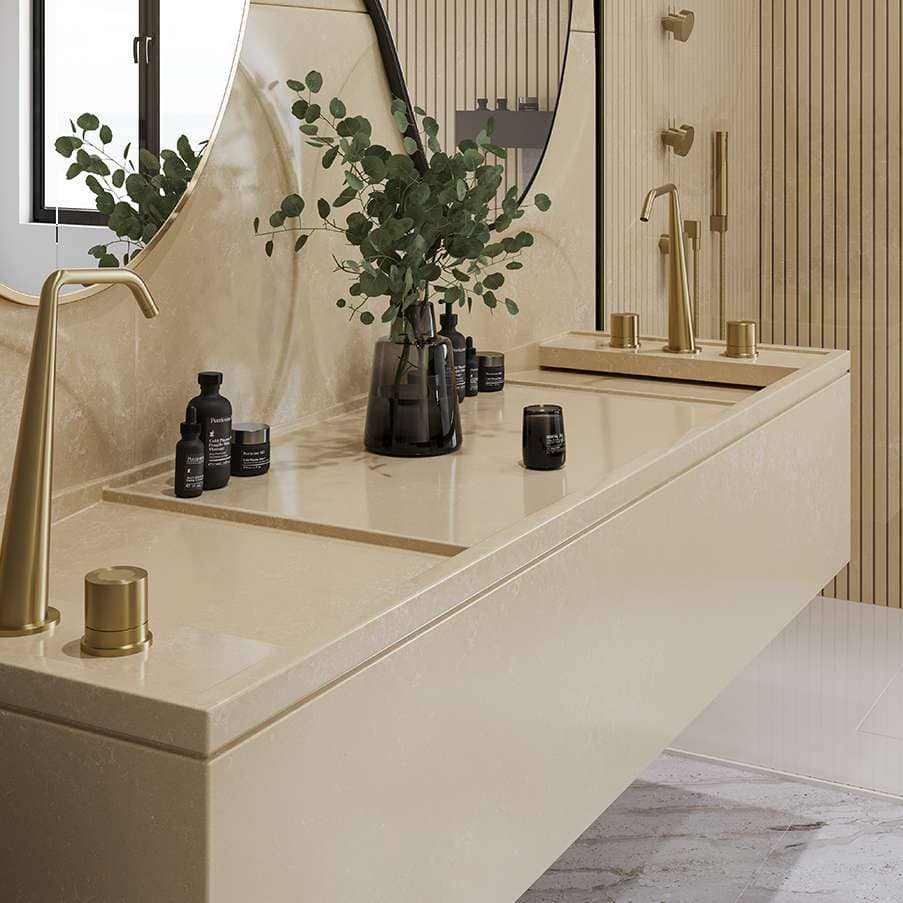 Specta’s lighter quartz options work exceptionally well here. Soft neutrals and gentle pastels reflect light, make spaces feel cleaner, and support smoother energy circulation. They also have the added benefit of making compact bathrooms look more open and airy.