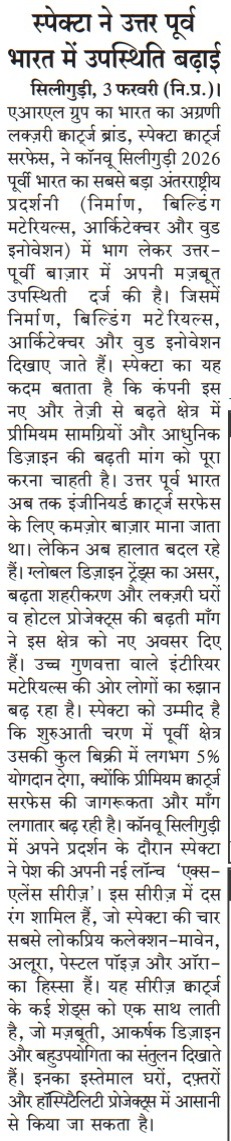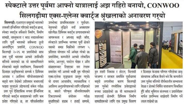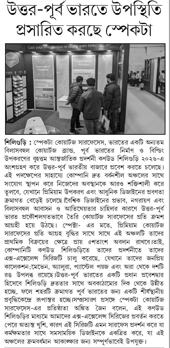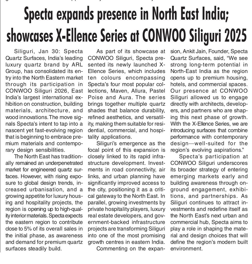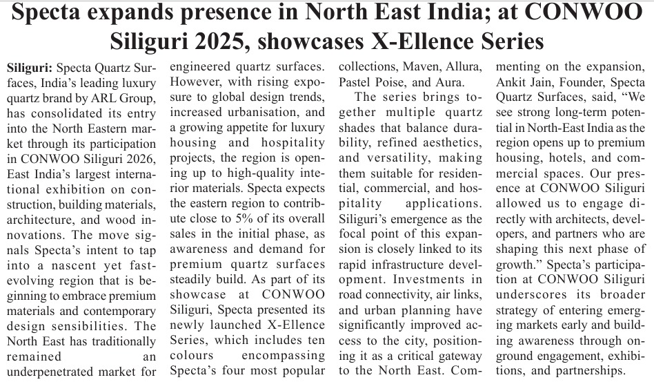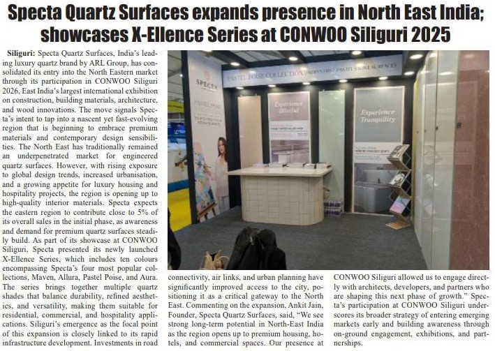 Specta Quartz Surfaces, India’s luxury engineered quartz brand from ARL Group, has strengthened its presence in North East India with a showcase at CONWOO Siliguri 2026, East India’s largest international exhibition for construction, building materials, architecture and wood innovations. The participation marks Specta’s intent to tap an emerging market that is witnessing rising urbanisation, exposure to global design trends and increasing demand for premium housing and hospitality projects.